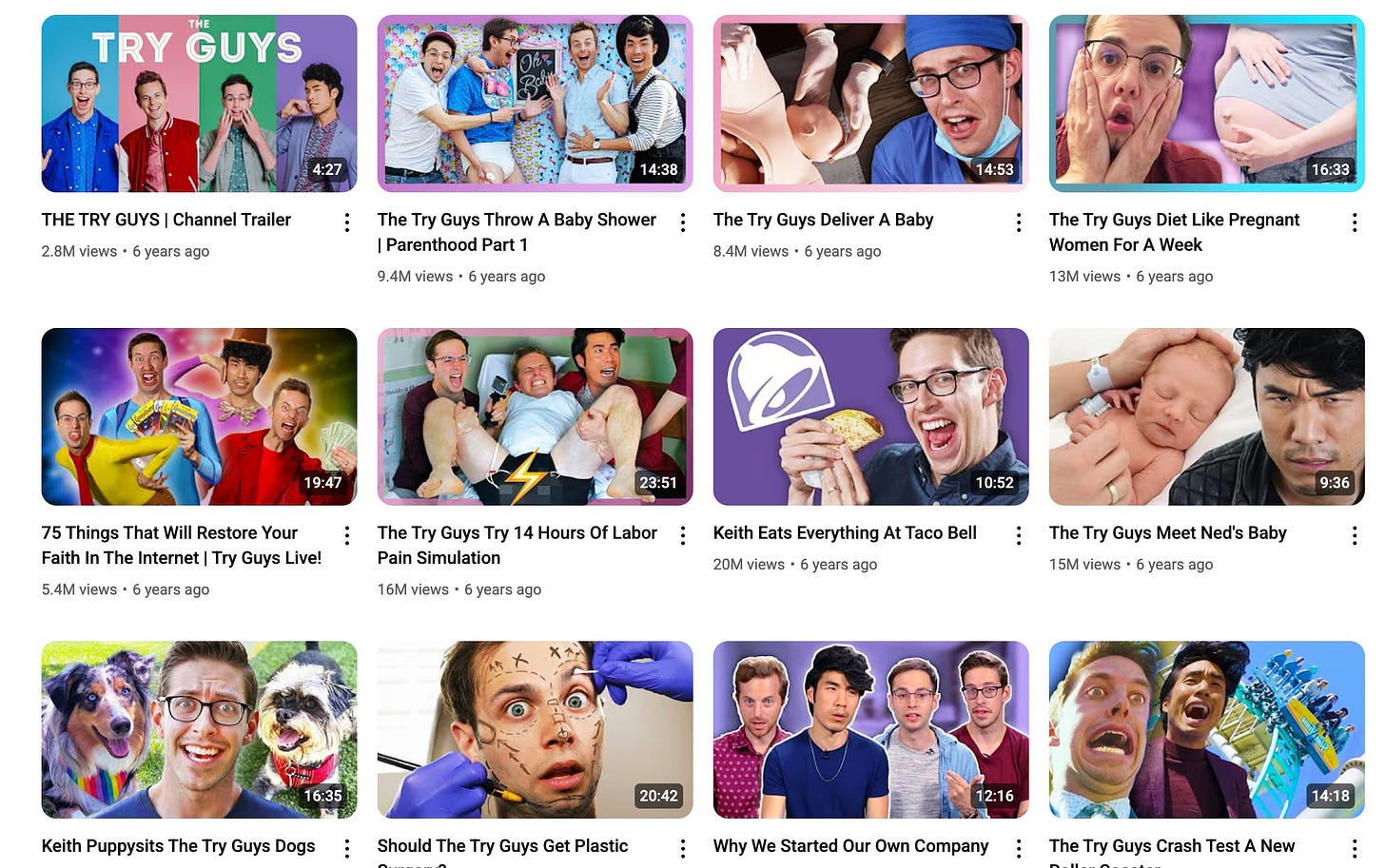 This is just a snippet of the oldest “Try Guys” videos. It’s 4 guys, trying stuff. And they repeated the words “Try Guys”, in the channel name, in the title, in their thumbnails, in their descriptions - you get the idea. , and now we’ll forever just associate them as the Try Guys, for better or for worse.